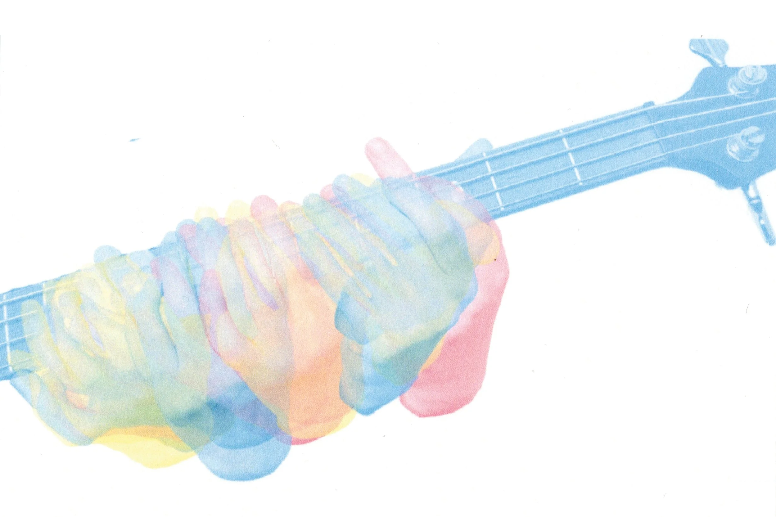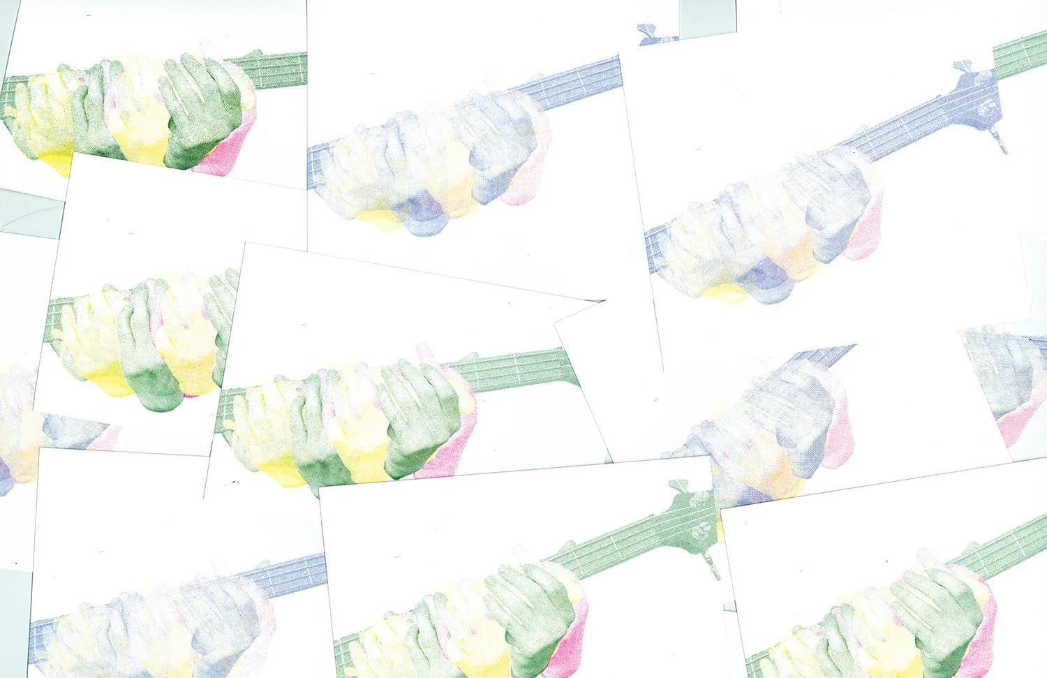 Photoviz is an information design Riso print showcasing multiple hand positions of the same song on the bass guitar. The work explores how photographic visualization and print processes can translate sound and movement into a tactile, visual form.