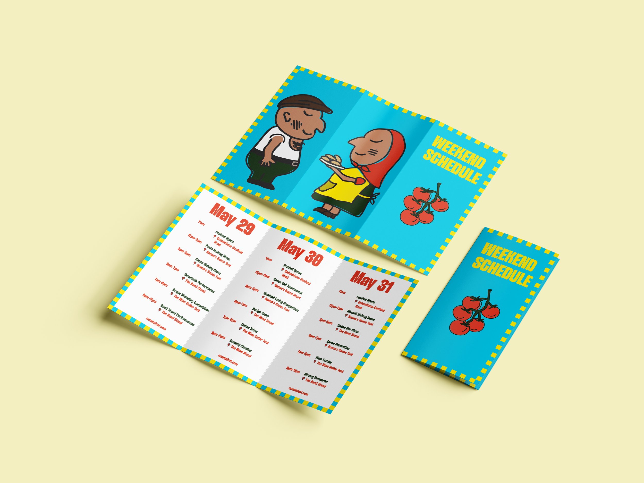 The illustrations are hand drawn and traced digitally. They can be interchanged to interact differently based on the deliverable. The deliverables include a pamphlet schedule, poster series, and festival booth examples.