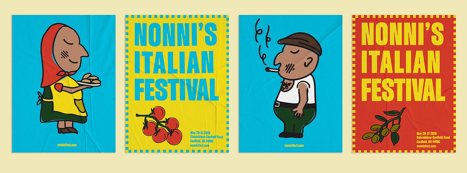 Nonni’s Italian Festival is a bright, playful, and colorful festival geared toward the younger generation of Italian Americans. The main characters, Nonna and Nonno, offer familiar and light hearted stereotypical imagery to the festival goers. Each illustration is simple and graphic.